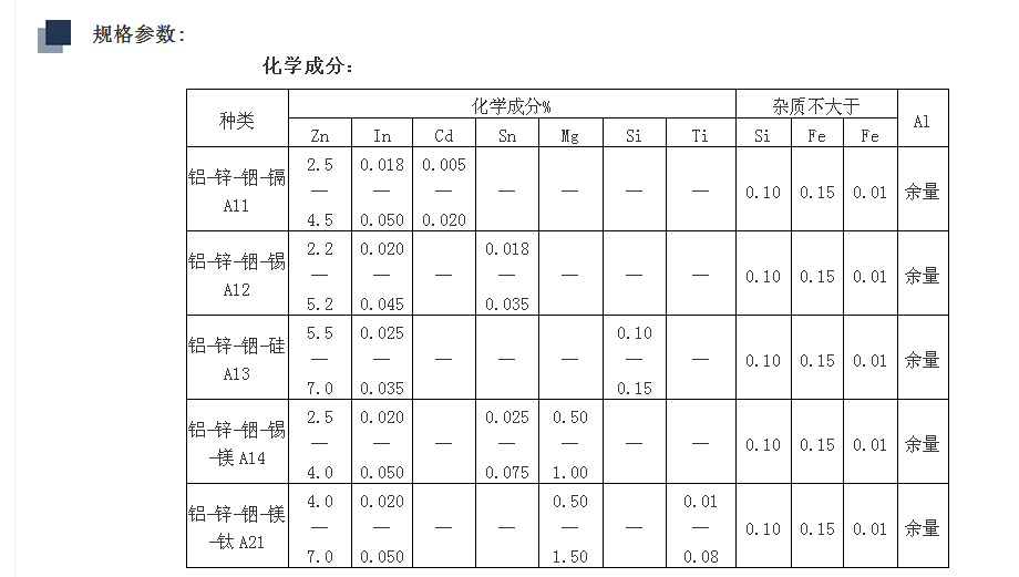我公司生產(chǎn)的鋁合金犧牲陽極采用優(yōu)良的原材料(鋁陽極原料純度不低于99%)多重質(zhì)檢工藝(雜質(zhì)質(zhì)檢、金相顯微分析、全套化學(xué)分析),